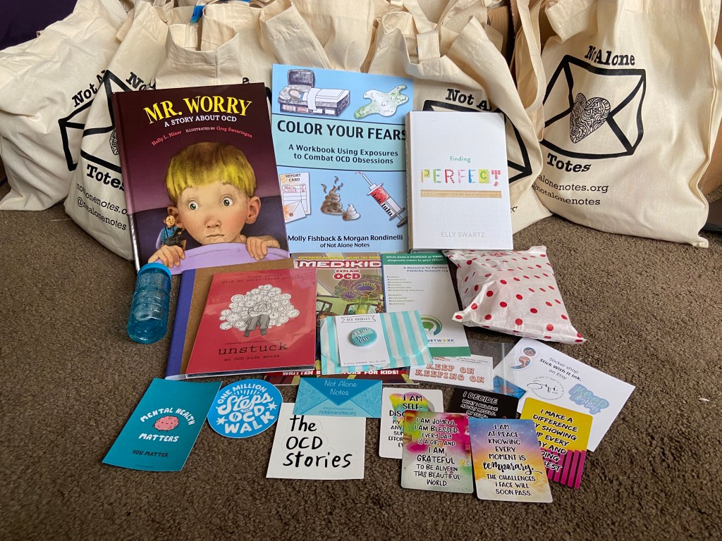 In January 2021, we made a trial run of 30 totes. The packages included a Not Alone Note, book, journal, fiddle items, stickers from OCD organizations/companies, and many more resources someone new to OCD could use. Since then, we have sent several more batches of totes out to folks new to OCD.